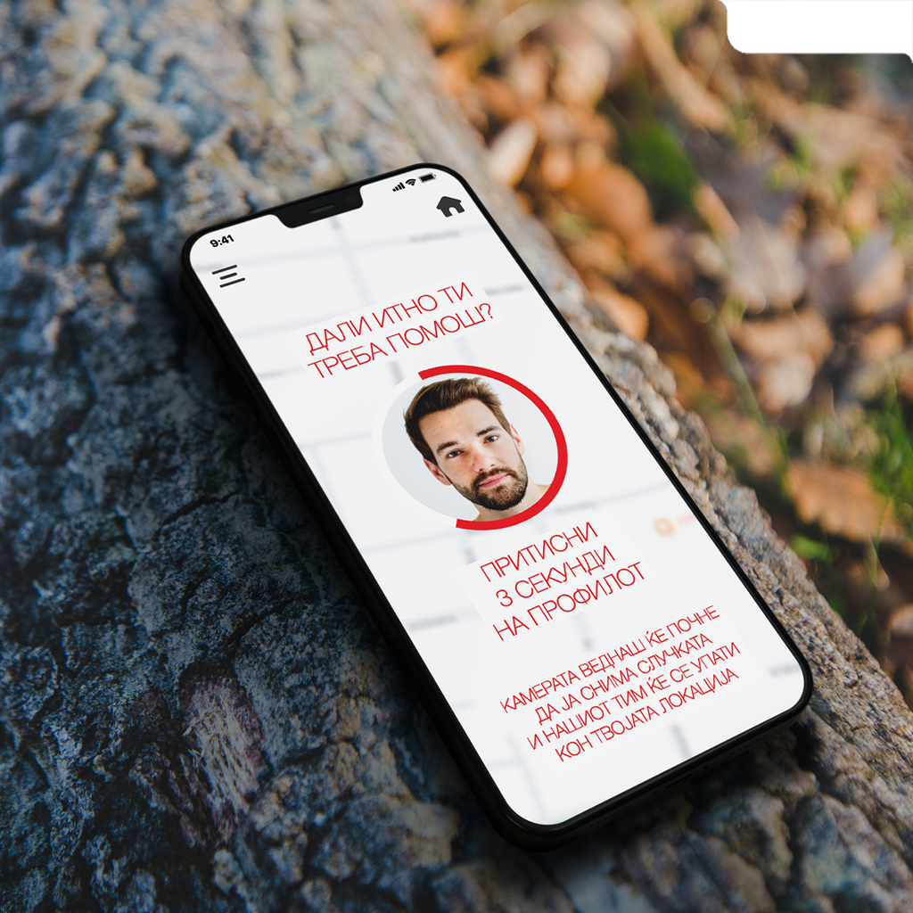 Притисни на твојата слика на средината на екранот, и задржи 3 секунди. Апликацијата испраќа барање за помош до нашиот мониторинг центар и екипата веќе е на пат.